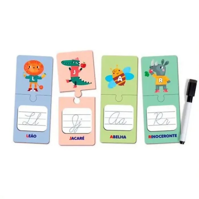 Contem 26 quebra cabeça com alfabeto ilustrado e 1 canetinha.