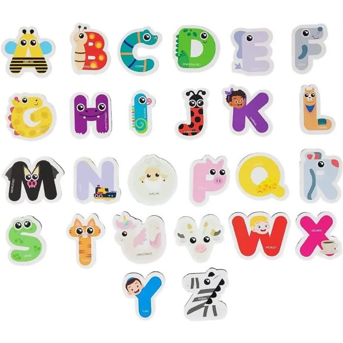 O alfabeto divertido reforça o aprendizado do alfabeto de maneira divertida e criativa. contém 26 letras ilustradas com o tema animais (as letras não tem associação às figuras), medindo 6 cm cada.