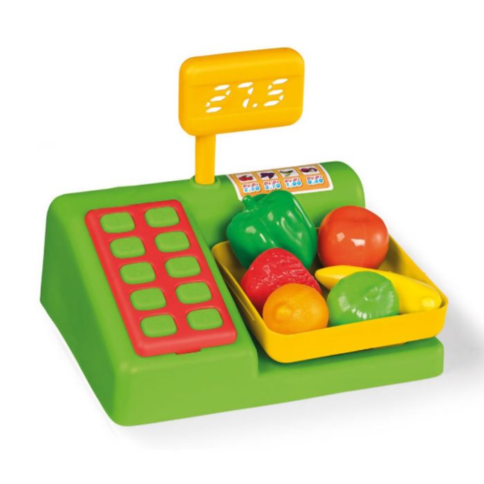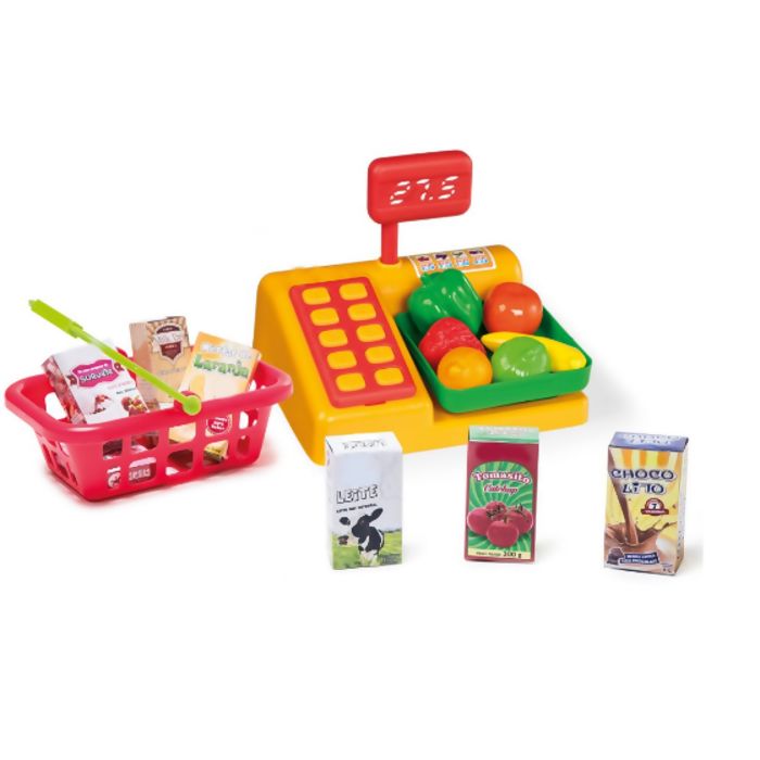 Para brincar de vender frutas, verduras, leite, gelatina, suco e até molho de tomate. É só escolher, colocar dentro da cestinha e e pesar tudo no caixa. Ah, só não pode esquecer de pesar as frutas e verduras na balança. Brincadeira do faz de conta que estimula o conhecimento geral através do aprendizado pela imitação.