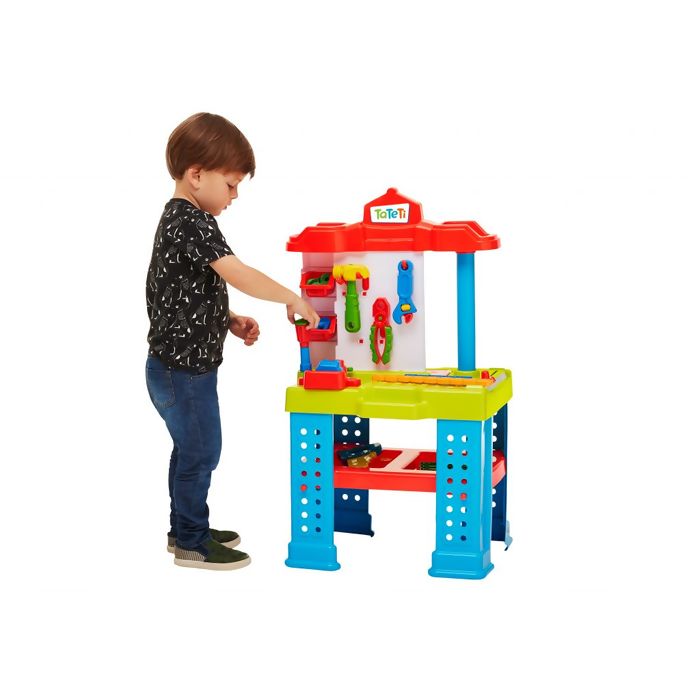 Uma bancada com duas frentes de trabalho colorida e equipada com diversas ferramentas e acessórios. A brincadeira será montar e desmontar, parafusar e soltar parafusos e o que mais a imaginação quiser!