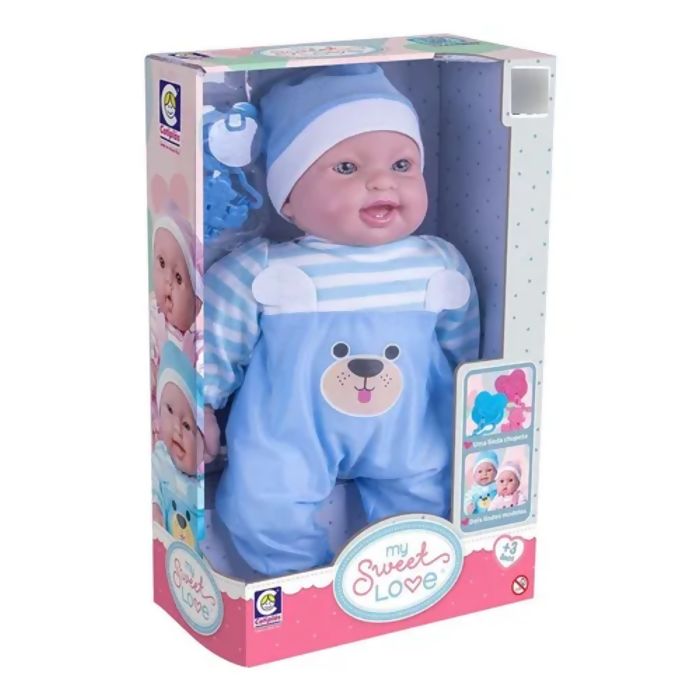 A Boneca My Sweet Love Menino é uma preciosidade em forma de brinquedo, encantando os corações das crianças com sua beleza e realismo. Com um macacão azul suave ao toque e uma touquinha combinando, este boneco é um retrato vívido de um bebê adorável e charmoso.