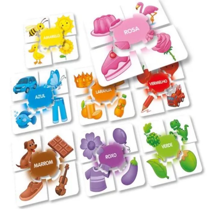 Brincando com as cores traz 8 das principais cores para a criança identificar, separar e encaixar as figuras correspondentes.