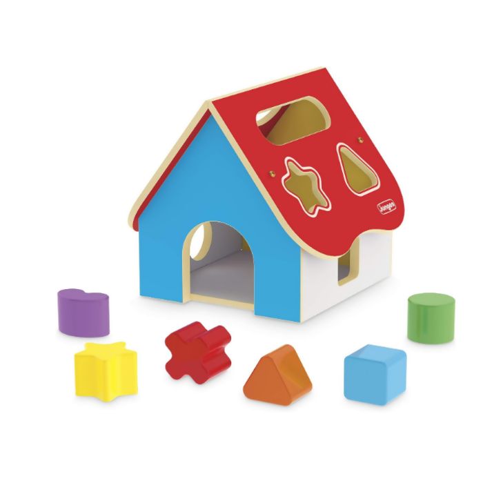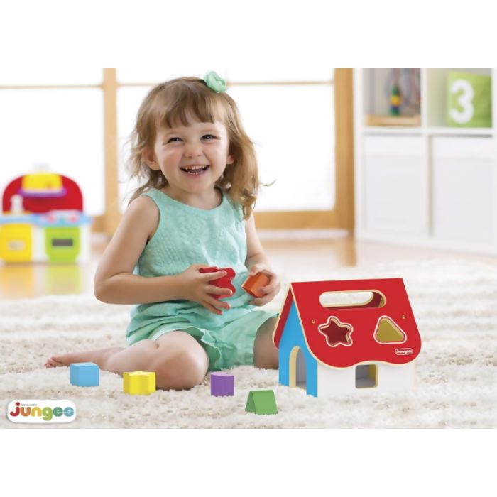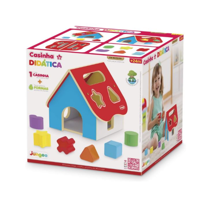 Casinha Didática da Junges em madeira de reflorestamento (MDF) com pintura atóxica e acabamento em serigrafia. Acompanha 1 kit com 6 peças plásticas coloridas e ergonômicas - formas geométricas. A Casinha Didática é um brinquedo educativo que auxilia as crianças no desenvolvimento da coordenação motora, atenção, percepção e aprendizado das formas e cores.