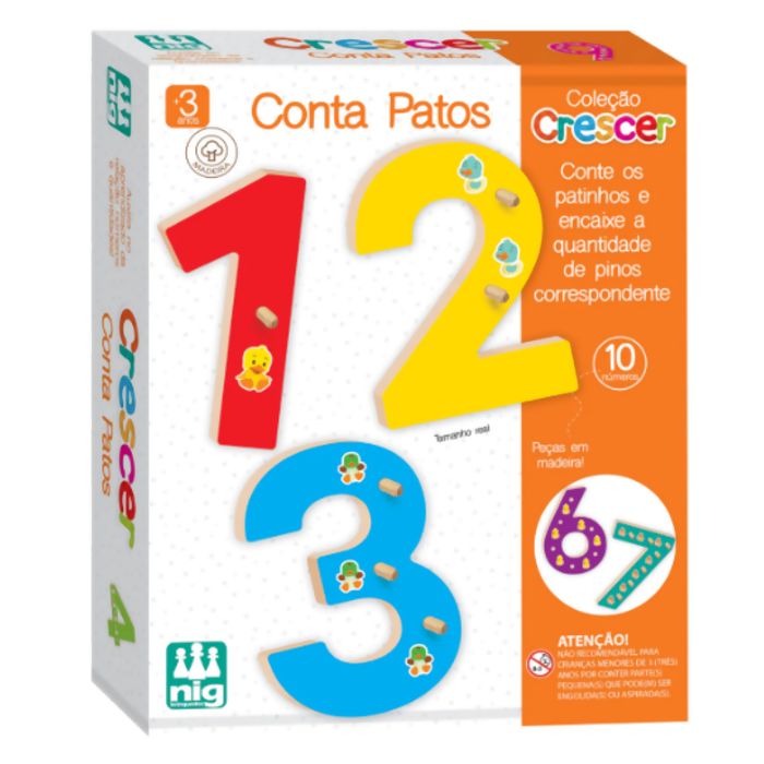 Objetivo desse jogo é contar os patinhos que estão em cada número e encaixar a quantidade de pinos correspondente.
