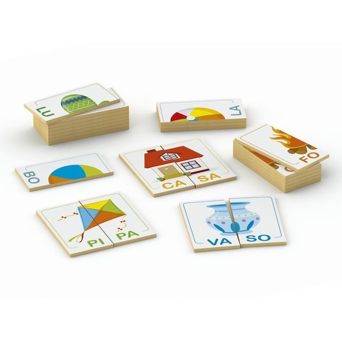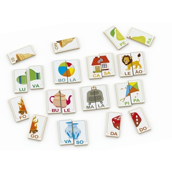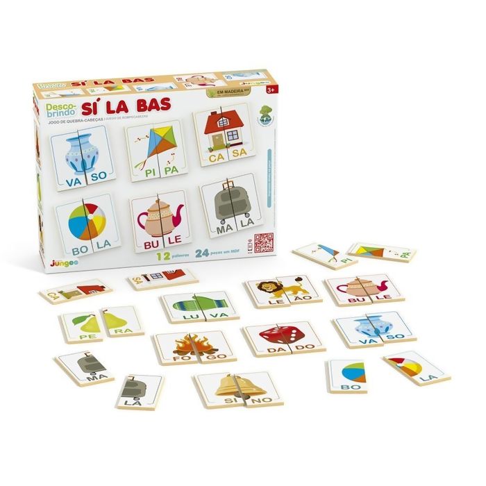 Jogo Descobrindo Sílabas da Junges com 24 peças em madeira de reflorestamento (MDF), que formam 12 cenas com palavras de 2 sílabas