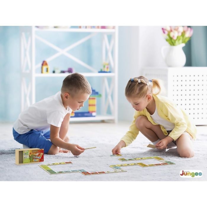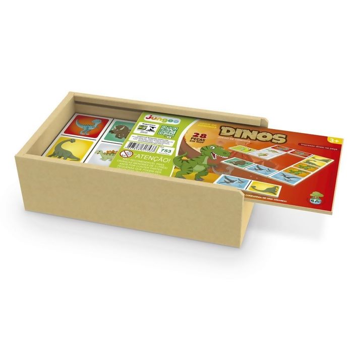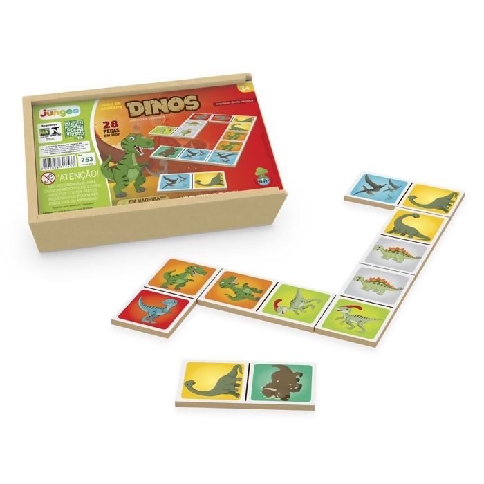Jogo Dominó da Junges com 28 peças de 3,5x7cm cada, em madeira de reflorestamento (MDF). Impressão direto na madeira com acabamento de alta qualidade, durabilidade e resistência.