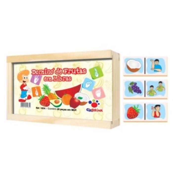 Descrição Domino Frutas em Libras Cia Brink Caixa de Madeira