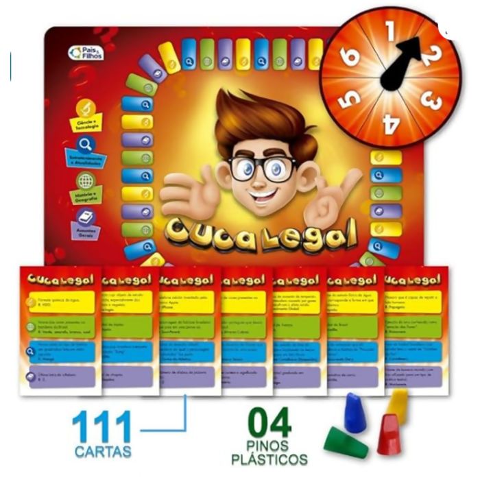 Cuca Legal é um jogo de tabuleiro da Pais e Filhos para brincar com até 6 participantes. Neste divertido jogo de conhecimento só quem tem cuca legal consegue chegar ao final. São 672 perguntas para testar seus conhecimentos e colocar a cuca para pensar.