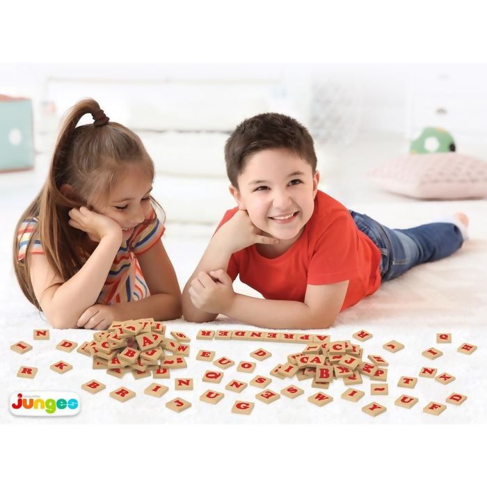 Jogo de Letras da Junges com peças em madeira de reflorestamento (MDF) em 6mm de espessura, com letras maiúsculas e acentos gráficos do alfabeto português, impressas em serigrafia direto na peça. Ideal para alfabetização. Formando Palavras!