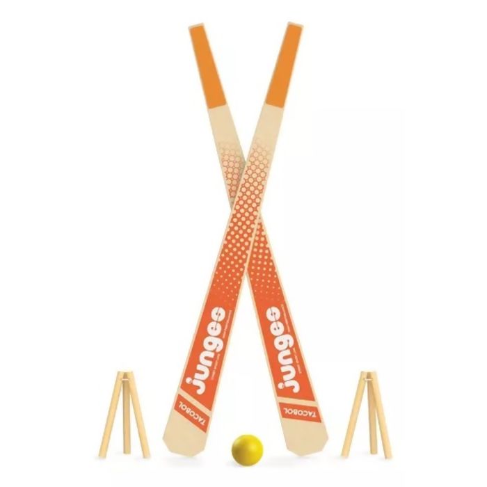 Kit de Tacos / Bets da Junges com 2 tacos 80x8cm em madeira de MDF 15mm com cabo emborrachado em EVA, 2 casinhas e 1 bolinha de borracha nº 3. Impressão em serigrafia.