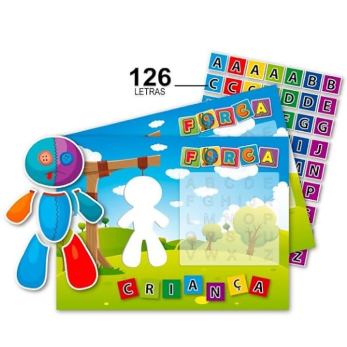 Se ele acertar uma letra da palavra do adversário, este deverá virar a letra na sua cartela, mostrando o local da mesma. Caso não acerte, deve-se localizar a letra que sobrou e colocar no local indicado no tabuleiro, informando que aquela letra já foi falada e pegar uma das 5 partes do boneco e colocar no respectivo lugar na forca. Preparados para se divertir? Auxilia também no aprendizado da escrita. Estimula a criatividade, concentração, sociabilidade e agilidade.