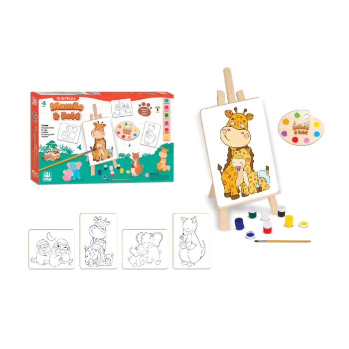 Lançamento da NIG, Kit de Pintura Mamãe e Bebê traz 04 telas em madeira com as mamães girafa, canguru, elefante e bicho- preguiça e seus filhotes fofos.