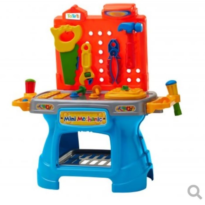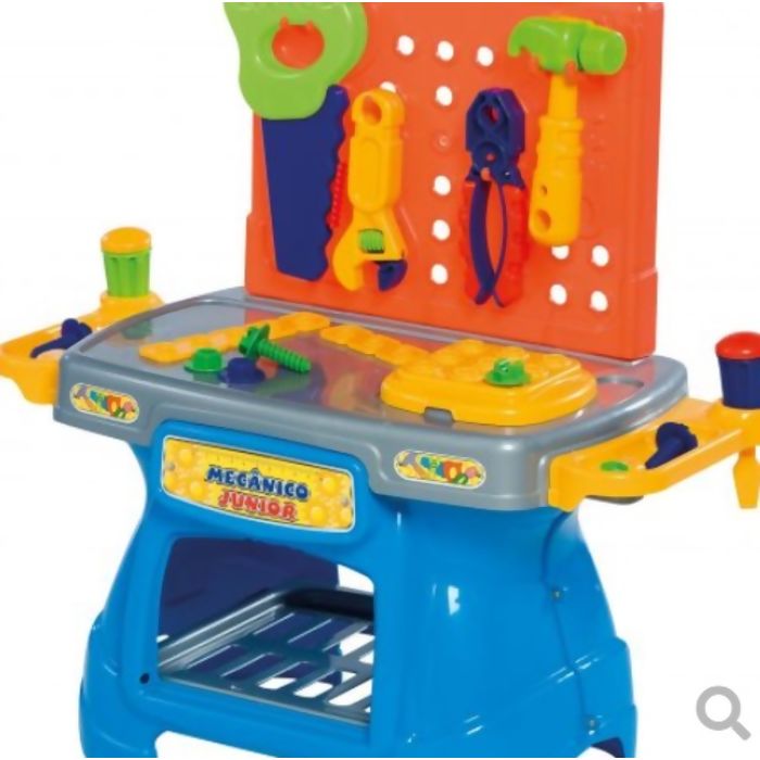 Uma bancada de trabalho colorida e equipada com diversas ferramentas e acessórios. A brincadeira será montar e desmontar, parafusar e soltar parafusos e o que mais a imaginação quiser. Estimula a criatividade, o raciocínio na resolução de problemas.