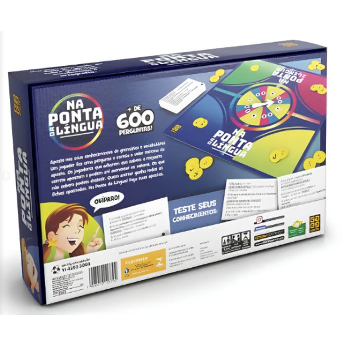 O jogo Na Ponta da Língua vem com 1 tabuleiro, 1 seta com suporte, 40 fichas moedas, 1 baralho com 264 cartas, 1 bloquinho de papel e 1 manual de instruções, onde você pode conferir todas as regras da brincadeira.