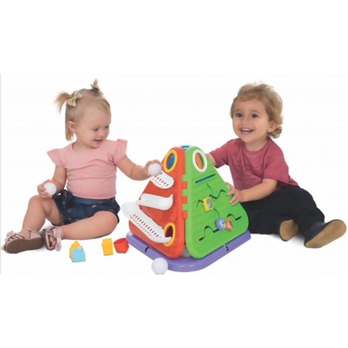 Descubra um mundo de diversão com a Pirâmide Educativa "Festa na Fazenda". Muitas atividades num brinquedo só. - Escorregador de bolinhas: Corre corre Galinha com 3 bolinhas - Labirinto da Fazenda "Dia e Noite", divirtase com o cavalo, a vaquinha e o trator.... durante a noite vamos descansar, durante o dia vamos trabalhar na fazenda. - Livrinho no pintinho: aprenda como nasce o pintinho - Portinha do estábulo abre-fecha... isso não acaba aqui. - Abra as paredes do triângulo gire elas, e divirta-se com a meia-bola didática e 5 forminas para encaixar. Estímula: - Distinção de formas - Raciocinío lógico - Coordenação Motora - Percepção Táctil. Idade Recomendada: +12 meses