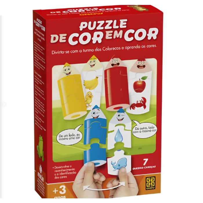 DE COR EM COR traz um conjunto de 7 quebra-cabeças coloridos que ajudam a criança a identificar e aprender as cores! Cada um dos quebra-cabeças é representado por uma cor distinta e é composto por 3 peças.