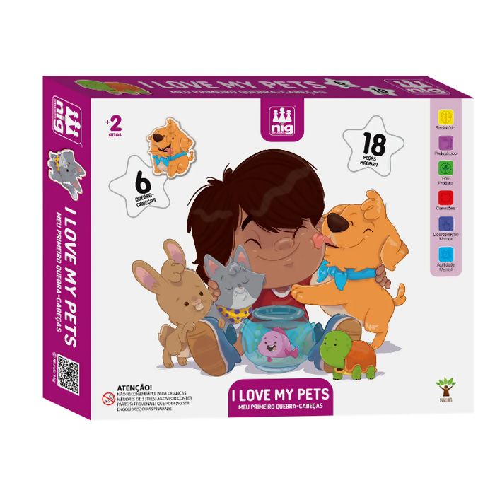 I Love My Pets é um quebra-cabeça progressivo para os pequenos começarem a aprender os encaixes e se encantarem com as imagens formadas.