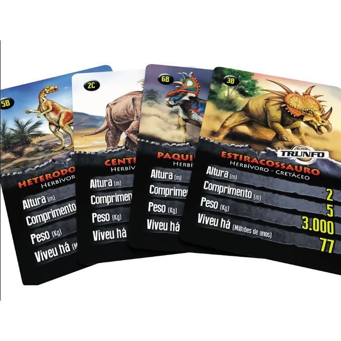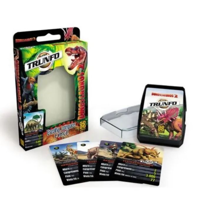 Super Trunfo Dinossauros traz 32 cartas com ilustrações e informações sobre os maiores seres-vivos que já habitaram a Terra Em qual item o dinossauro da sua carta é o melhor? Será em altura? Em peso? Ou você tem o Super Trunfo? Escolha, compare e vença esta emocionante disputa!