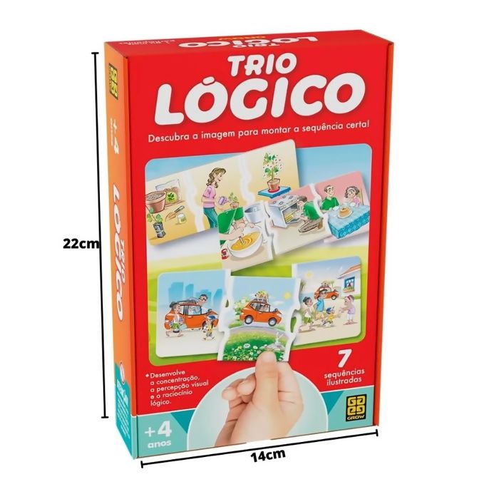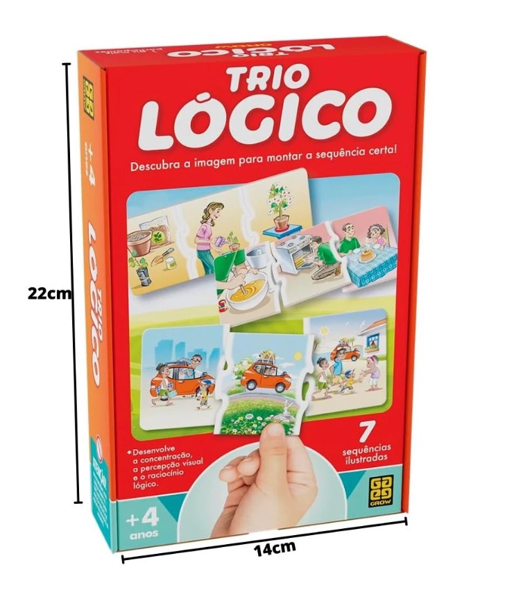 O Jogo Trio Lógico da Grow desafia você a descobrir a imagem correta para montar a sequência ideal! Nele, a criança se envolve em atividades que envolvem associação e ordenação cronológica entre cenas, estimulando o raciocínio lógico de maneira divertida e educativa.