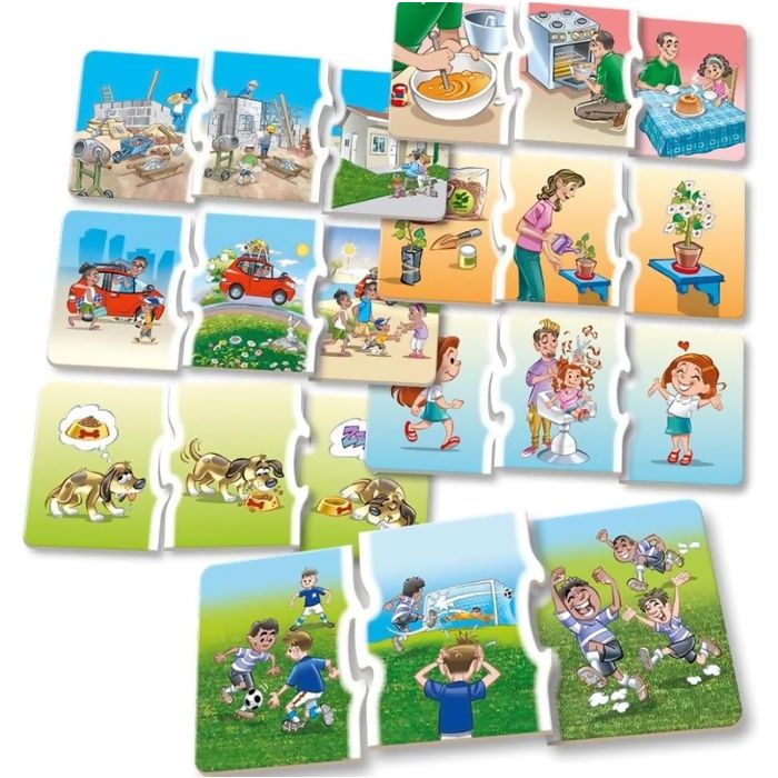 Cada cartela apresenta ilustrações que devem ser comparadas para reconhecer a relação entre elas. Ao encaixar as peças na ordem correta dos acontecimentos, a criança forma uma sequência de três partes que resulta em uma cena completa, promoven ...veja mais